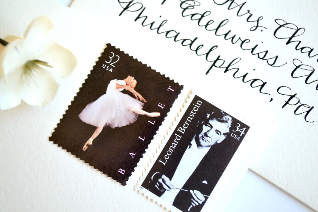 These vintage stamps are perfectly suitable for use as postage, as long as you use additional stamps to add up to the current postage rate. These beautiful ballet dancer stamps will add an enchanting personalized touch to your black and white wedding invitations, save the dates, or greeting cards.