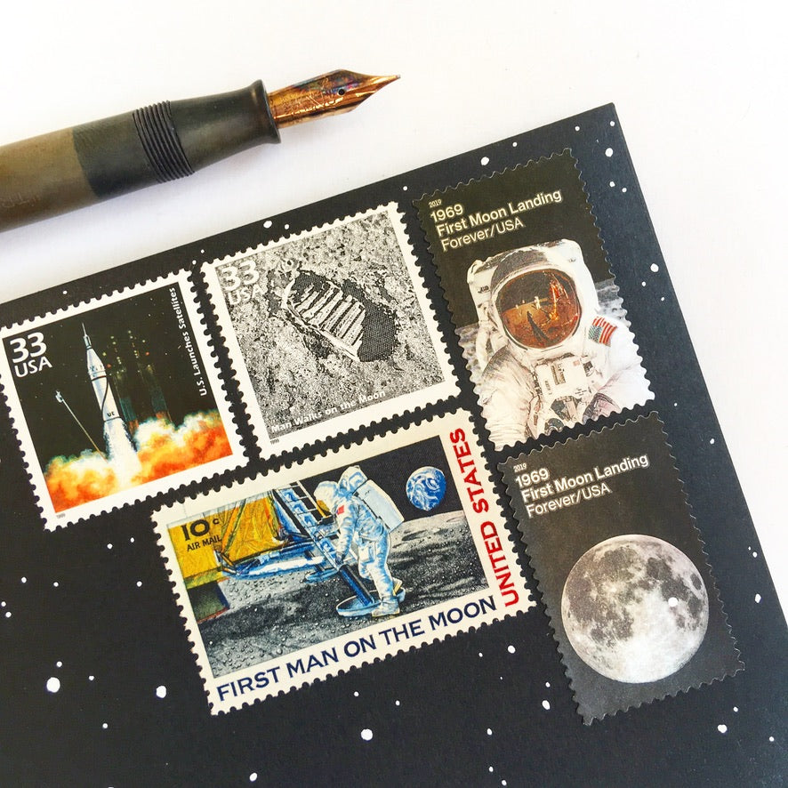 My space stamps are perfectly suitable for use as postage for mailing, as long as you use additional stamps to add up to the current postage rate. These stellar 1960's moon landing stamps will add a cosmic touch to your outer space / star cards or wedding invitations and save the dates.