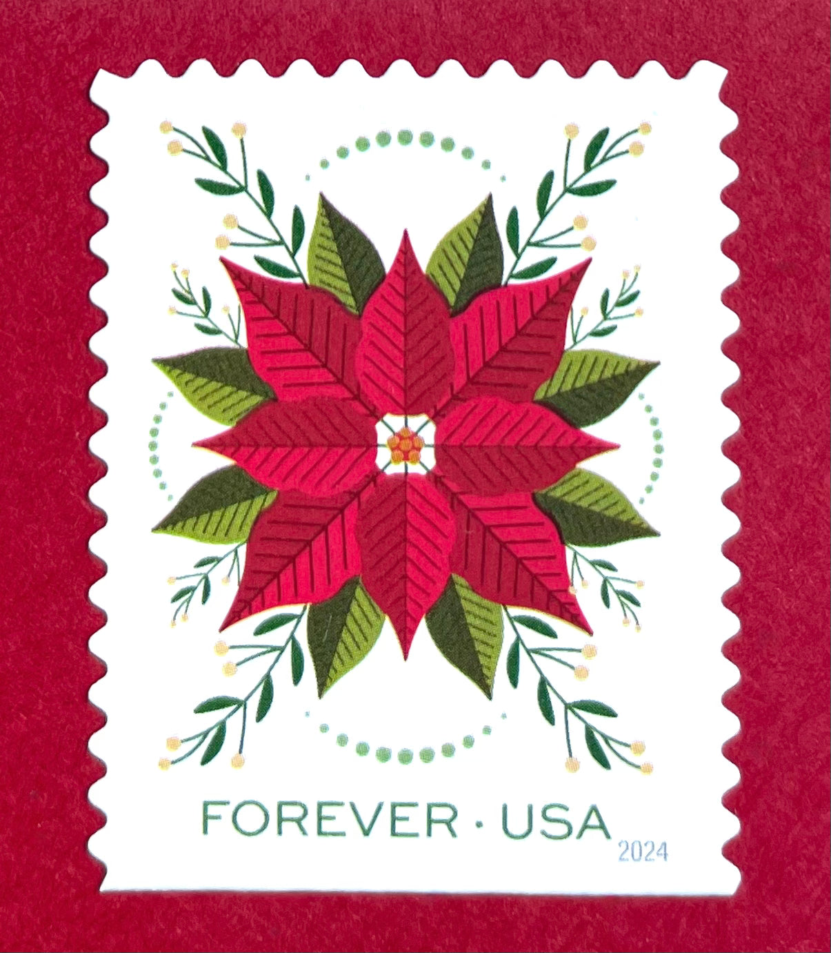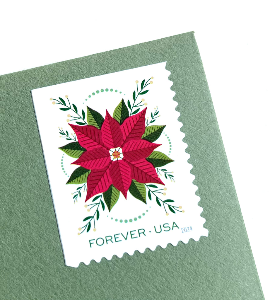 These Poinsettia holiday stamps are perfectly suitable for use as postage for mailing at the current rate. These beautiful red and green stamps will add a charming touch to your Christmas cards, holiday mail or winter wedding invitations or greeting cards.