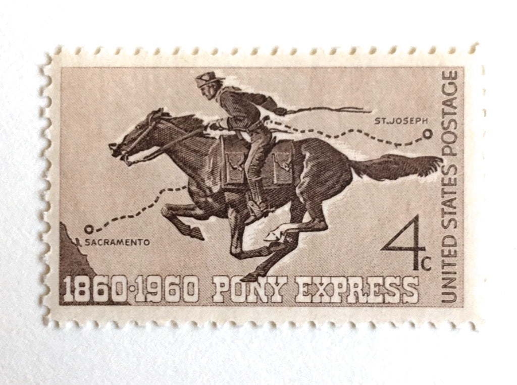 10 Pony Express Postage Stamps / Western Cowboy Mail Delivery // 1960 Vintage 4 Cent Unused Postage Stamps for Mailing