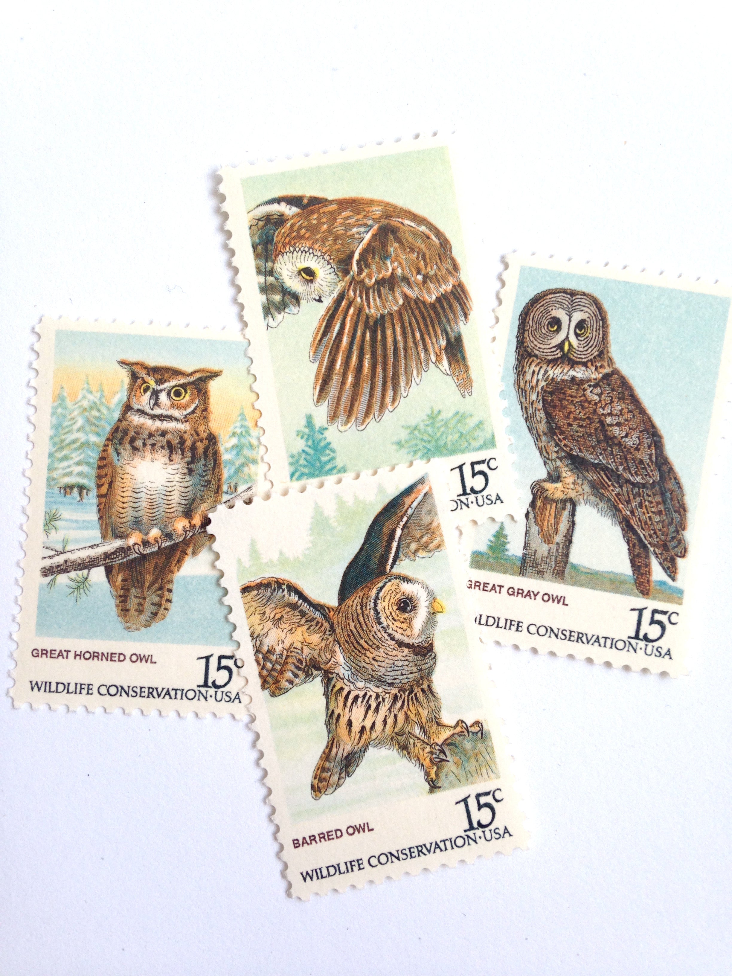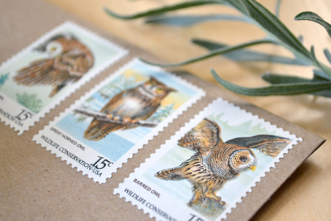 12 Owl Postage Stamps Unused Vintage Forest Owls // Pine Trees and Owl Wildlife Stamps for Mailing