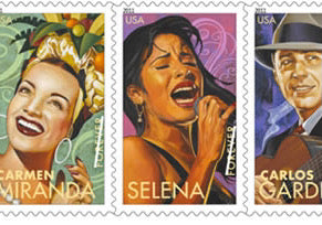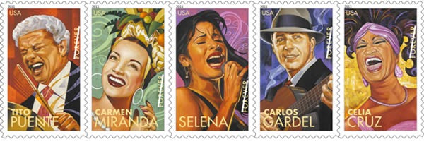 5 Latin Music Legends Postage Stamps // Latino and Latina Singers & Musicians: Selena // Carmen Miranda // Tito Puente // Carlos Gardel
